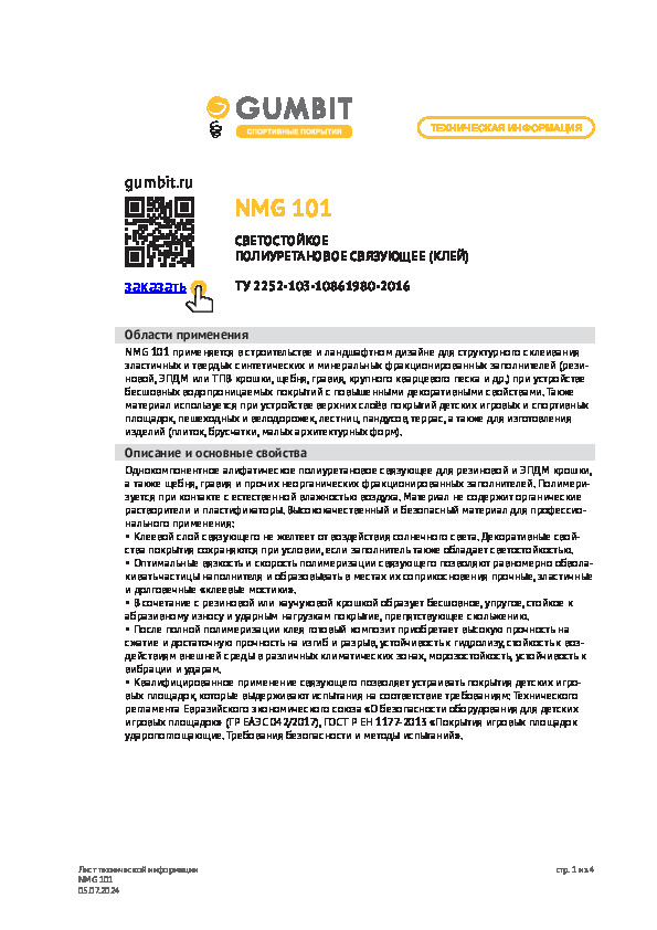 Полимерное связующее. Предназначено для создания спортивных покрытий из резиновой крошки. Хорошо взаимодействует с наполнителем даже при низких температурах — от 3 °C.